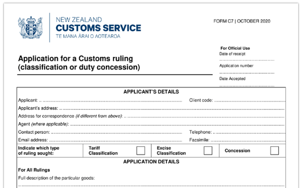 La decisione doganale deve essere richiesta dall'importatore o dal produttore al Servizio doganale neozelandese, Valuation, Origin and Classification, PO Box 29, Shortland Street, NZ-Auckland 1140, numero di telefono: +64 9 8664651, sito web: https://www.customs.govt.nz.