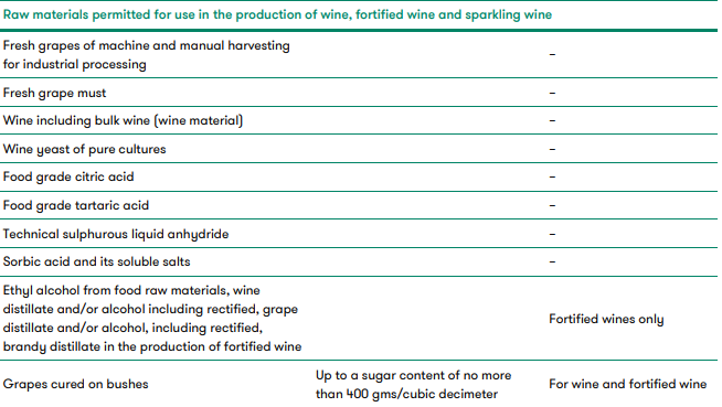 10 Alcolizzazione, ovvero aggiunta di alcol etilico da materie prime alimentari o distillato di vino, particolarmente corretto, distillato d'uva, particolarmente rettificato, o distillato di frutta, in particolare rettificato, o distillato di miele separatamente o in combinazione, tranne che per l'uso di alcool etilico proveniente da materie prime alimentari o distillato di vino, in particolare rettificato, per la produzione di vini fortificati, nonché distillato di vino, in particolare rettificato, o distillato di uva, in particolare quello rettificato, per produrre il liquore da utilizzare nella fabbricazione di vini spumanti