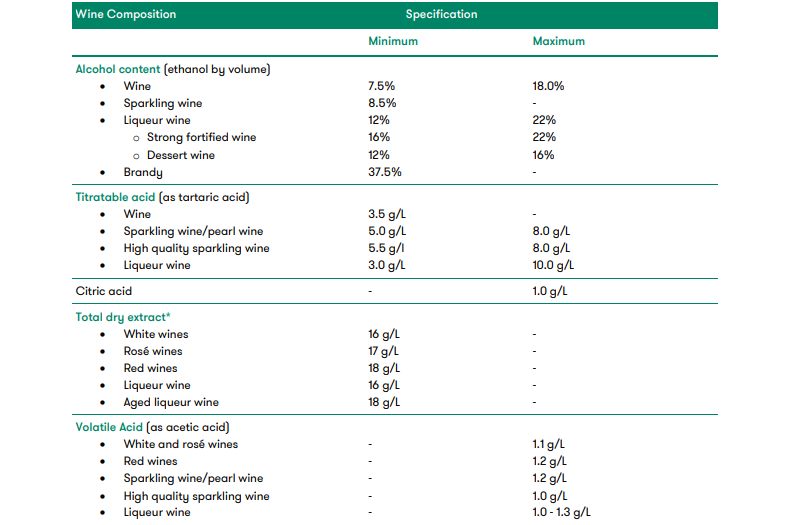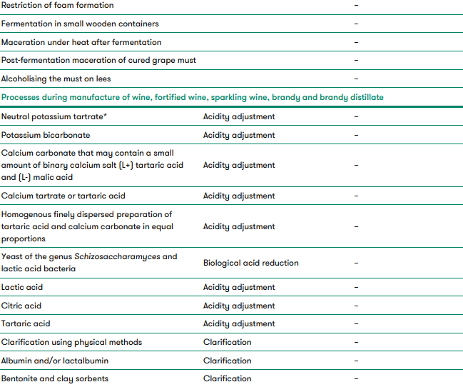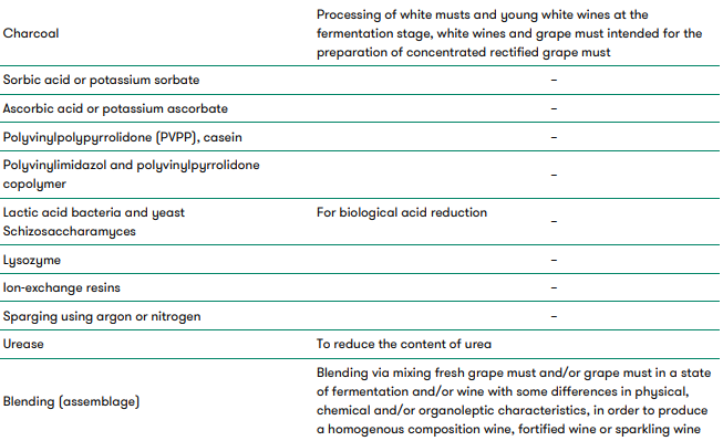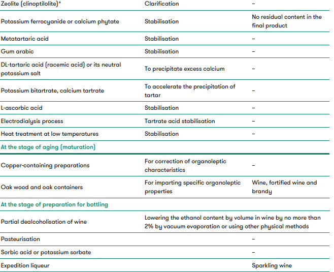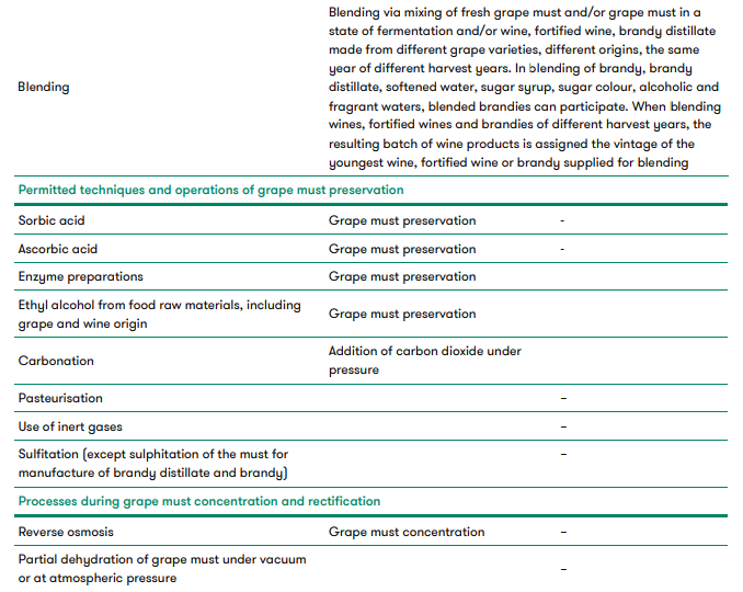 Il seguente elenco di tecniche proibite appare nella legge federale russa. L'elenco non è replicato nell'EAEU TR 047/2018, tuttavia è vietato utilizzare qualsiasi ingrediente in prodotti alcolici non elencati nella tabella sopra