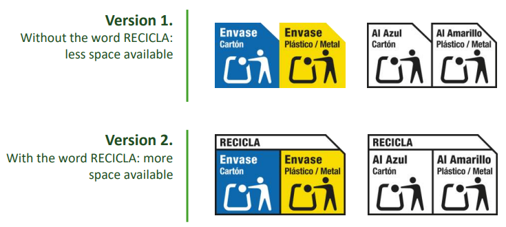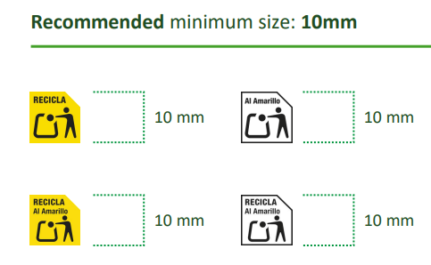 La società Ecoembes raccomanda di utilizzare i loghi colorati al fine di facilitare il consumatore. Tuttavia, è possibile utilizzare i loghi in bianco e nero indicando il colore del contenitore di destinazione all’interno del logo stesso.