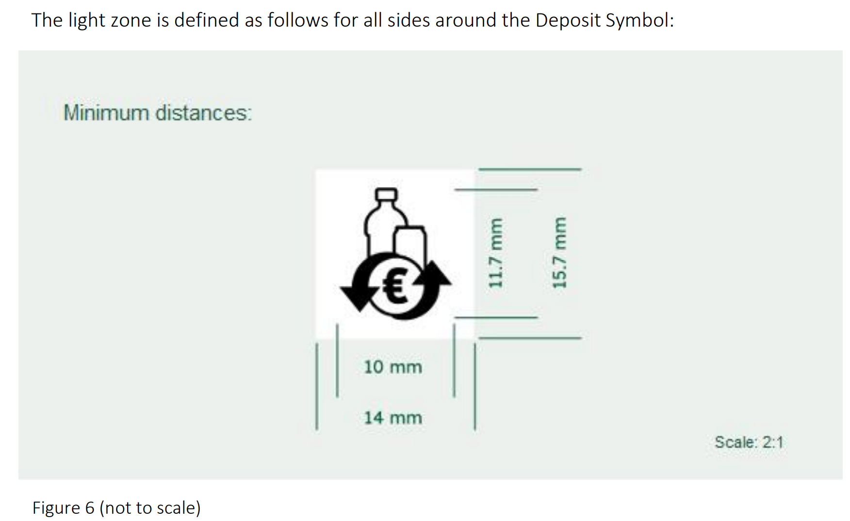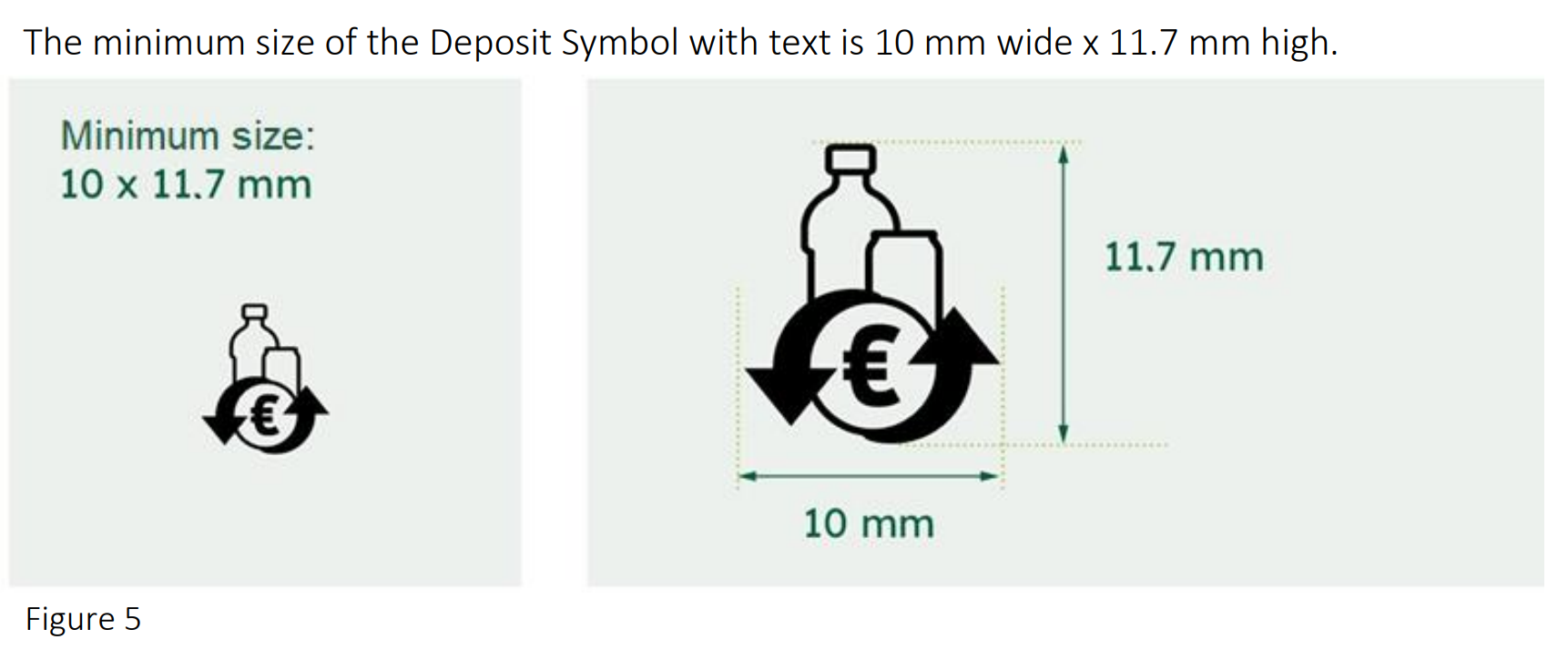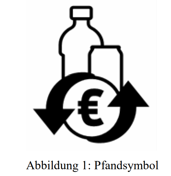 Il simbolo del sistema di deposito monouso è costituito dal simbolo € circondato da frecce di riciclaggio e dai simboli di una bottiglia e di una lattina sullo sfondo. Deve essere rappresentato in nero su sfondo bianco.
