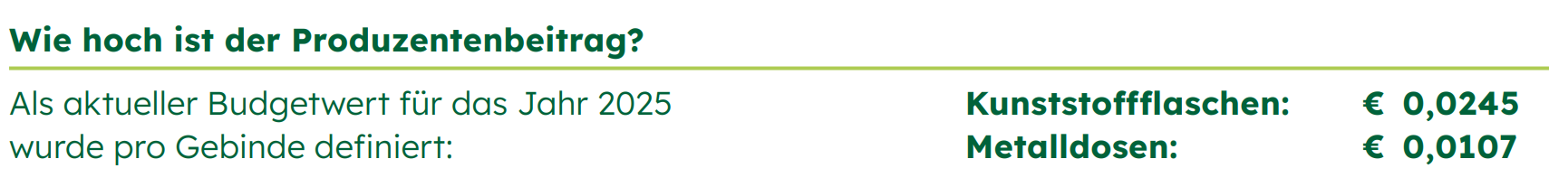 L'importo del contributo del produttore viene determinato e pubblicato regolarmente, almeno annualmente, da Recycling Pfand Österreich, a seconda del materiale (plastica o metallo). Il contributo tiene conto di tutte le entrate (ad esempio, le quote di registrazione, i ricavi dei materiali e gli importi dei depositi non versati) e di tutte le spese del sistema (ad esempio, il rimborso delle spese per i destinatari (quota di gestione), i costi di raccolta, selezione, conteggio e trasporto, nonché i costi per l'ufficio centrale). Il regolamento stabilisce inoltre che il contributo del produttore deve essere calcolato per articolo.