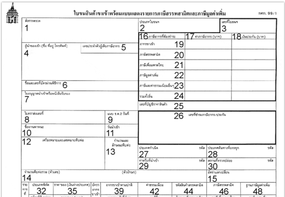 Il documento, in lingua thailandese, è denominato:ใบขนสินค้าขาเข้าพร้อมแบบแสดงรายการภาษีสรรพสามิตและภาษีมูลค่าเพิ่ม.