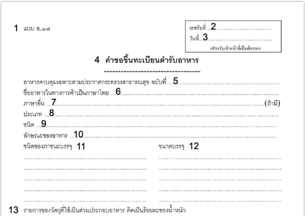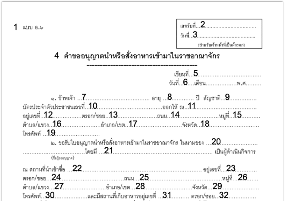 In lingua thailandese, il documento è denominato คำขออนุญาตนำหรือสั่งอาหารเข้ามาในราชอาณาจักร.
