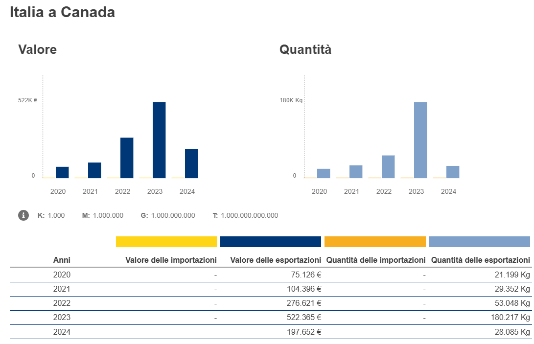 Si riportano di seguito il valore e la quantità delle esportazioni destinate al mercato canadese, tenuto conto del mercato italiano e dello scenario europeo.